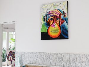 ヘッドフォンをつけて、まるでDJのような猿のアートです。